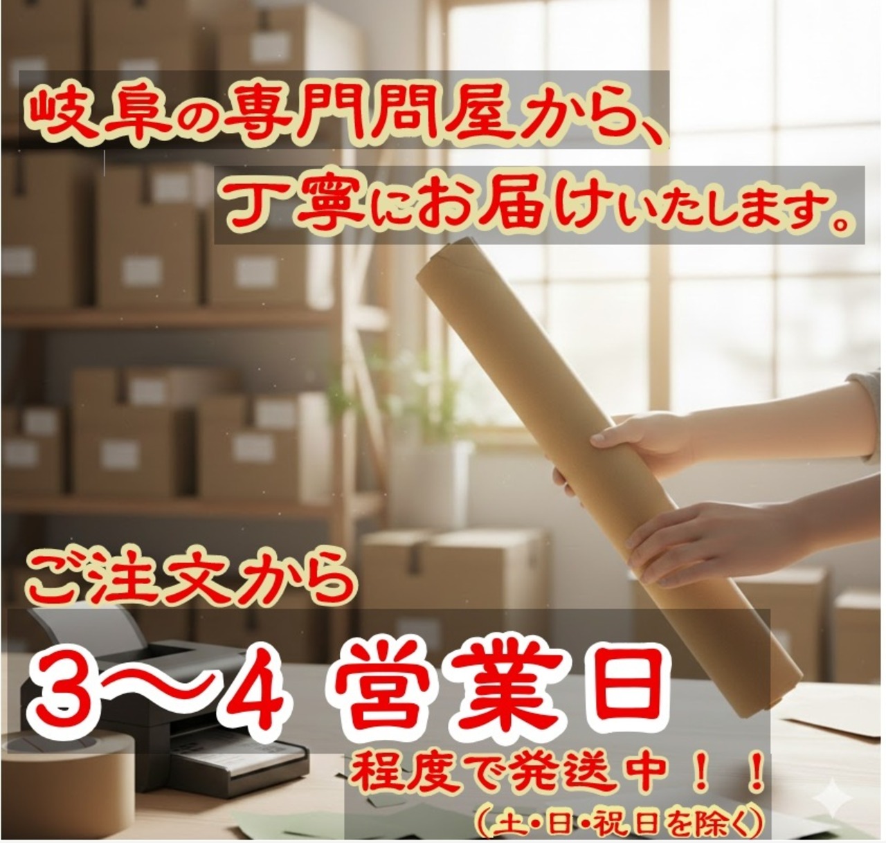 ご注文頂きました商品(障子紙・ふすま紙等)は、基本的に紙包みに巻いた状態で発送致します。
